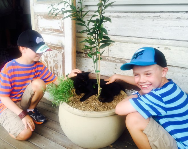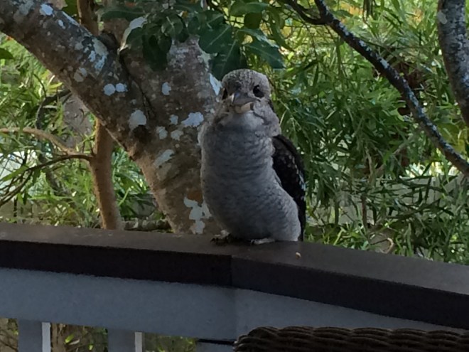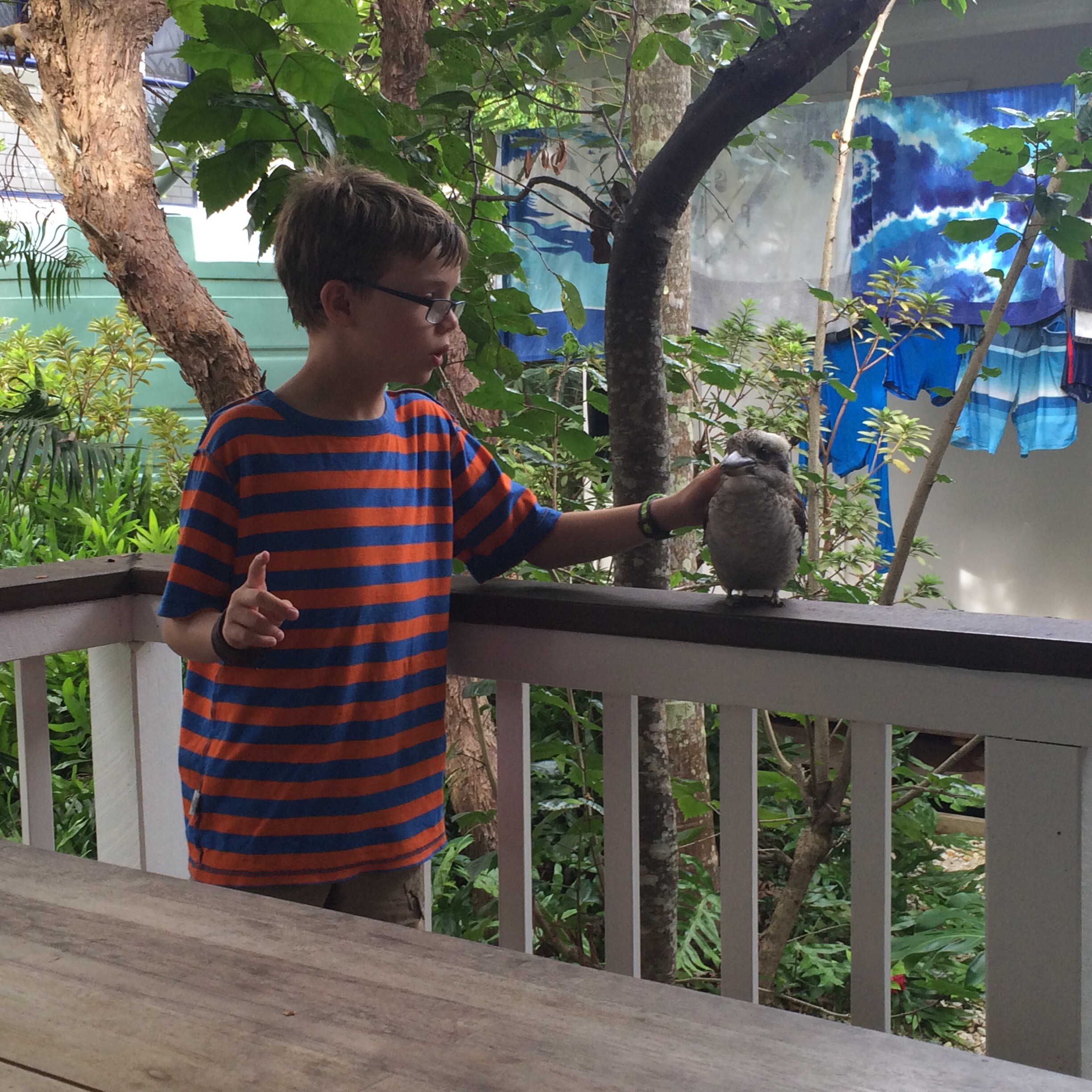 Today we saw so many animals. The first animal that we saw was a cat that was laying down in a pot. The second time was when I saw a snake slowly slithering around our towels. The snake was about the size of Jack and had a big black head. The last animal that I saw was my kookaburra friend named Tim. I got to pet Tim and rub his furry tommy.