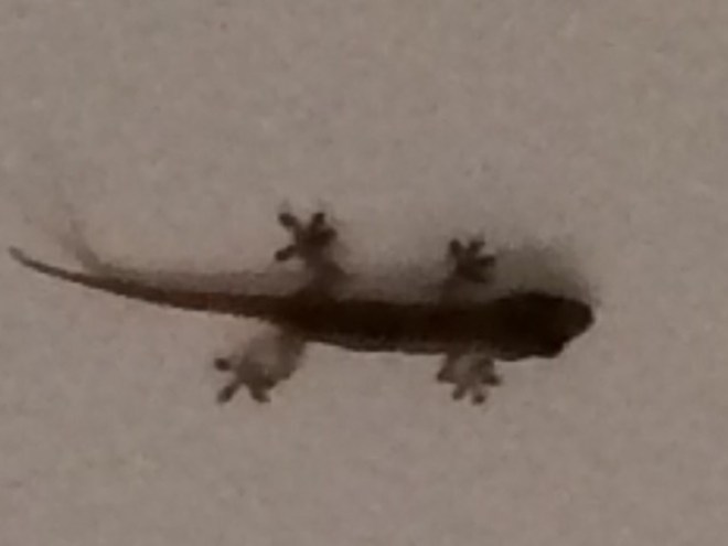 This is our roommate Sticker. He is a baby geeko that we found in our room. We named him Sticker because he can pretty much stick anywhere. He eats all the mosquitos and flies.